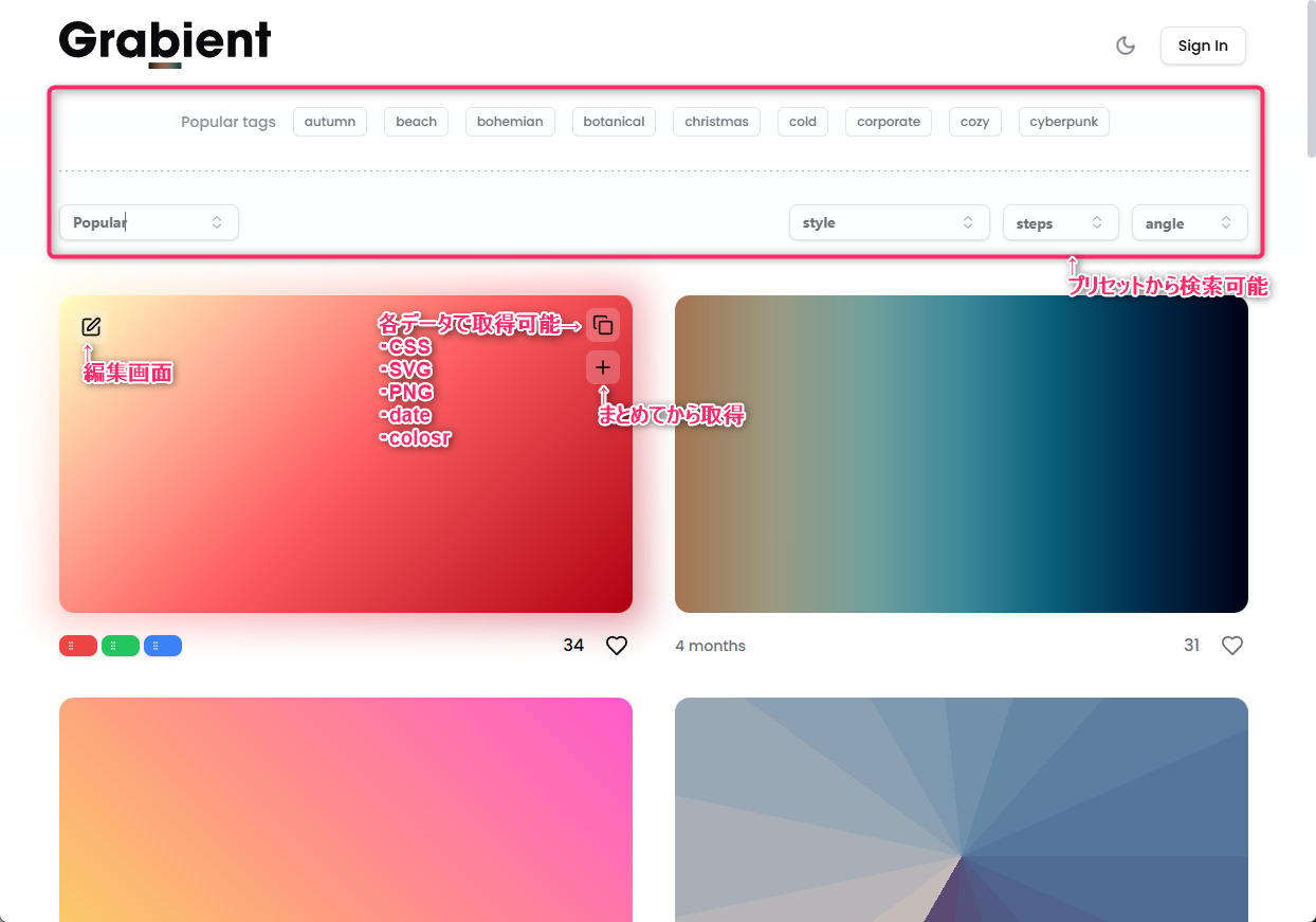 ページにたくさんのグラデーション見本が並んでいます。まずはその中から「好みの見た目」のものをクリック!プリセット検索も可能で様々にカテゴリから選択可能です。
