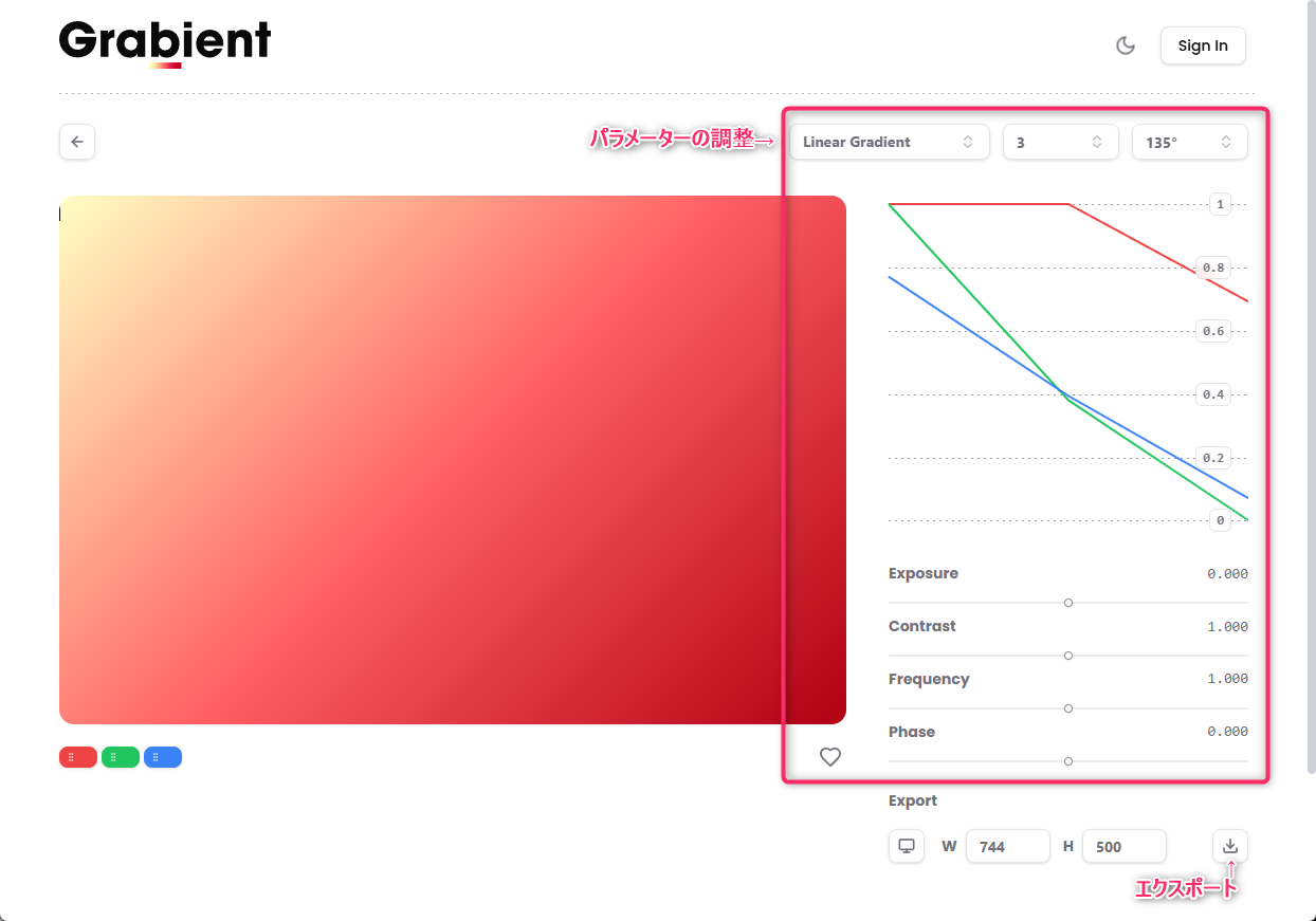 また、グラデーションの種類や角度、色数、彩度、明度などパラメーターを直感的に変更できます。