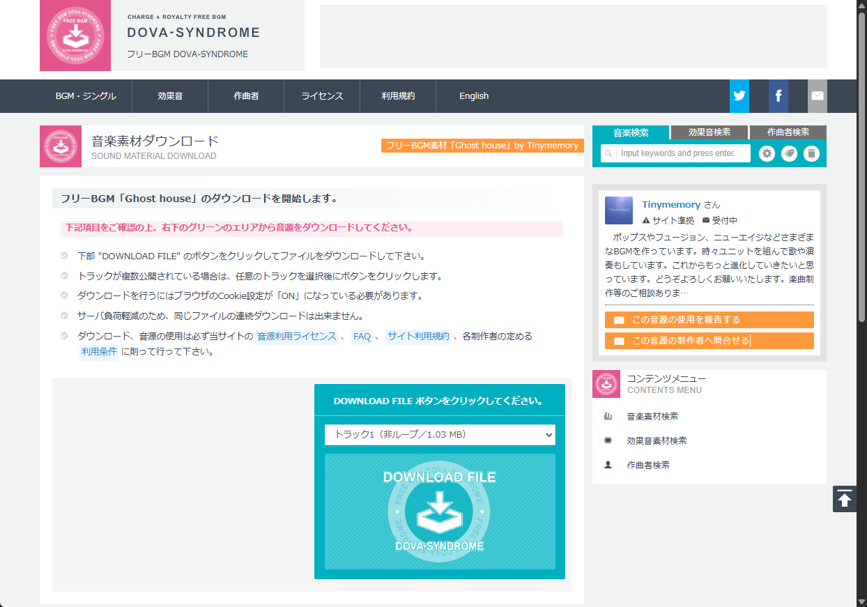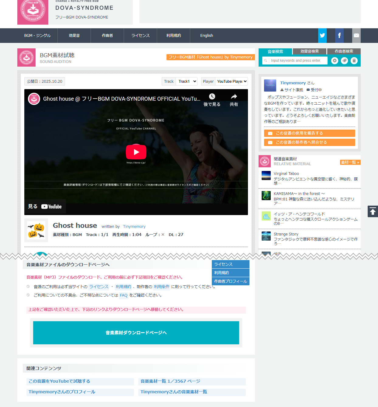 楽曲詳細ページで視聴後、気に入れれば下方の「音楽素材ダウンロードページ」をクリック。